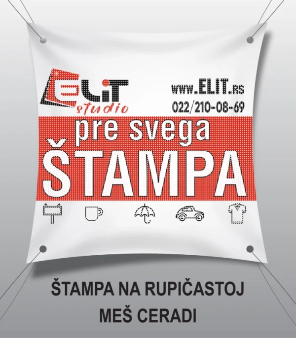 Perforirina rupičasta cerada je namenjena za spoljašnje brendiranje prostora, štampa na meš platnu je uv i vodotoporna. Jedna od osnovnih karakteristka štampe na meš platnu je vetropropusnost materijala (jer rupičasta struktura materijala sprečava stvaranje efekta jedra).