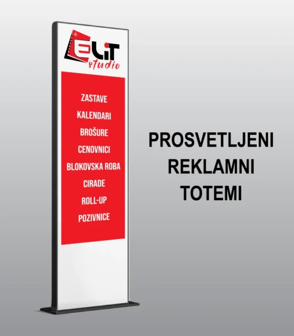 Svetleće reklame i totemi su provereni u outdoor indoor brendiranju prodajnih lokacija i objekata. Štampa se radi na translucentnim folijama za prosvetljavanje tehnikom digitalne štampe u kombinaciji sa različitm vrstama materijala, profila i načina prosvetljavanja. Svetleće reklame i totemi su provereni u outdoor i indoor brendiranju prodajnih lokacija i objekata.