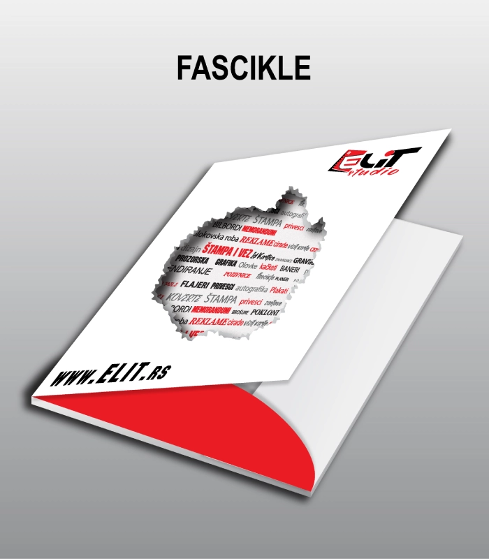 Fascikle se najčešće rade ofset štampom u A4 formatu, a cena zavisi od tiraža, broja boja za štampu, od toga jel štampa jednostrana ili dvostrana kao i načina dodatnog ukrašavanja fascikli. Mi Vam nudimo standardne templejte-štancne i oblike fasikli, ali po Vašoj želji je moguće raditi izradu alata prema Vašem dizajnu čime se dodatno povećava cena ( za vrednost štancne) čime dobijate unikatan oblik ili dimenziju fascikle.