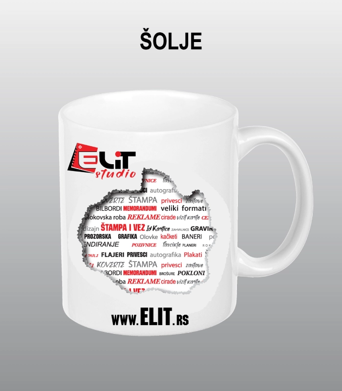 Radimo štampu na kermičkim šoljama od jedne boje do punog kolora, tehnikama sito ili sublimacione štampe u zavisnosti od modela šolje. Nakon štampe se radi termo fiksacija štampe čime ona postaje ne periva i veoma postojana pri stalnom korišćenju. Naše reklamne šolje su izuzetno kvalitetne površinske galzure što je bitan preduslov za kvalitetan otisak štampe i ono što je vrlo važno mogu da se peru u mašini za mašinsko pranje suđa.